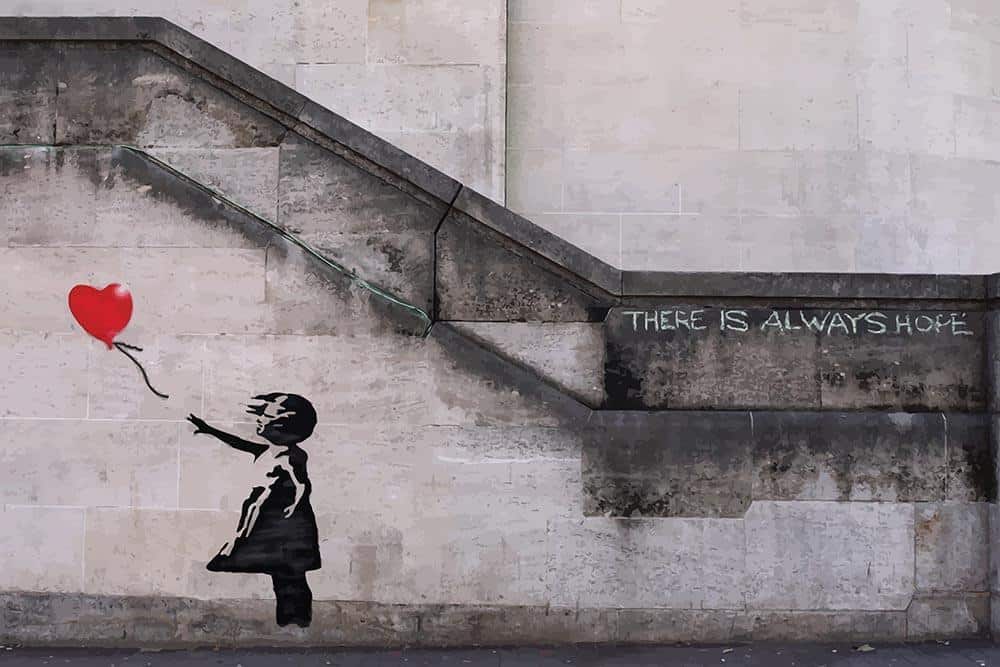 «Девочка с шариком» — самая любимая среди зрителей и в то же время значимая работа художника. Она появилась в 2002 году в Лондоне. Маленькая девочка — воплощение невинности и беззащитности. Ее хочется оберегать. Эту работу Бэнкси повторял и в последующие годы творчества. В 2014 году граффити стало символом протестов против войны в Сирии. Была запущена акция с хэштегом #WithSyria.
